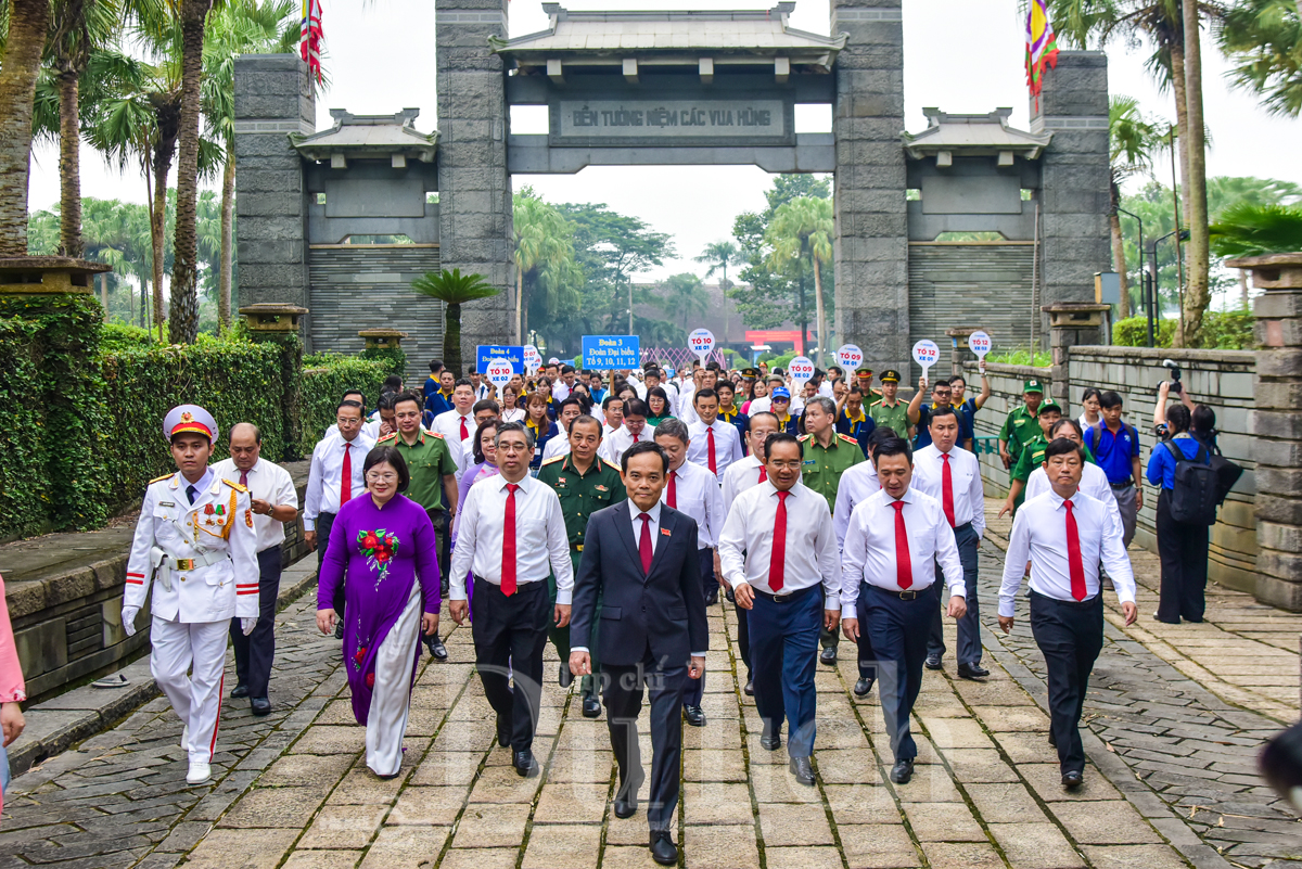 Trong không khí trang nghiêm, các đại biểu đã thành kính tưởng nhớ công đức to lớn của các Vua Hùng và các bậc tiền nhân đã có công dựng nước.