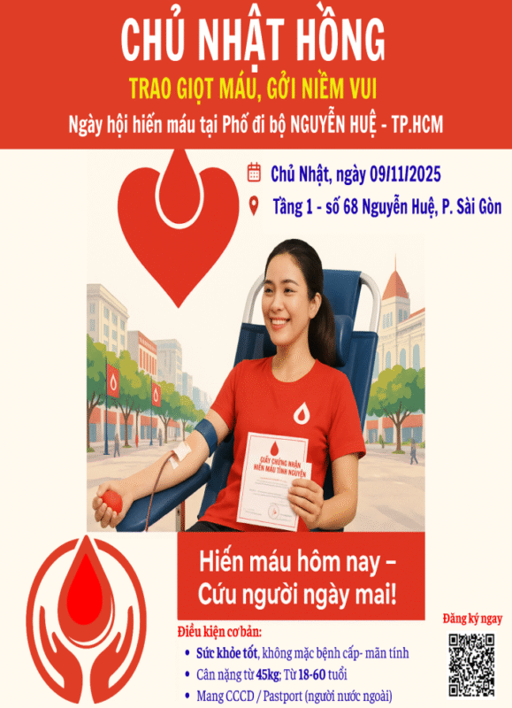 “Hiến máu – ĐIỂM HIẾN MÁU 68 Nguyễn Huệ” (phố đi bộ Nguyễn Huệ)”