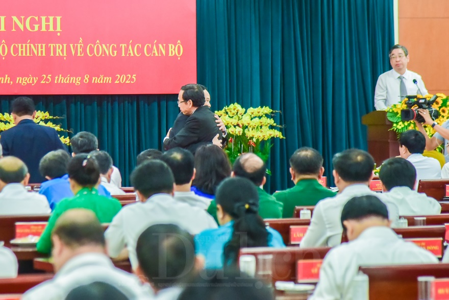 Khoảnh khắc xúc động nguyên Bí thư Thành ủy TP.HCM Nguyễn Văn Nên chúc mừng  Bí thư Thành ủy Trần Lưu Quang sau khi nhận quyết định nhiệm vụ mới, sáng 25/8/2025.