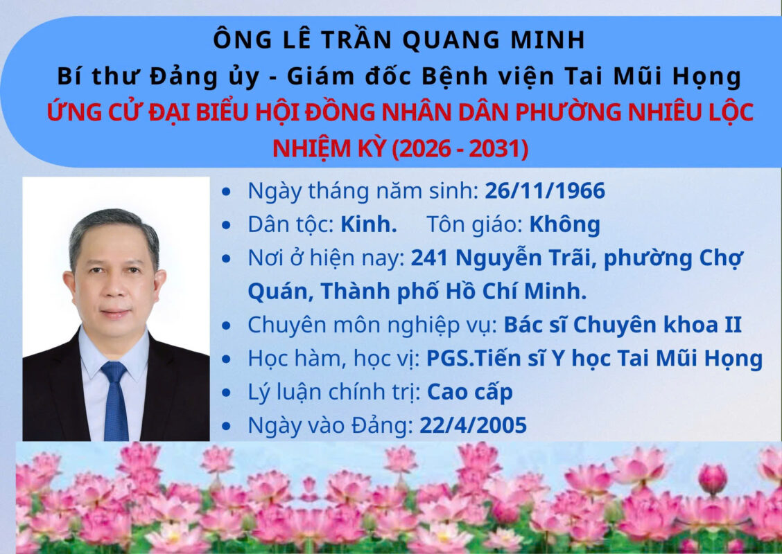 Ứng cử Đại biểu hội đồng nhân dân Thành phố, nhiệm kỳ 2026-2031Ông Lê Trần Quang Minh, Bí thư Đảng ủy, Giám đốc Bệnh viện Tai Mũi Họng – Ứng cử viên Đại biểu Hội đồng Nhân dân Phường Nhiêu Lộc, Thành phố Hồ Chí Minh, nhiệm kỳ 2026 – 2031.